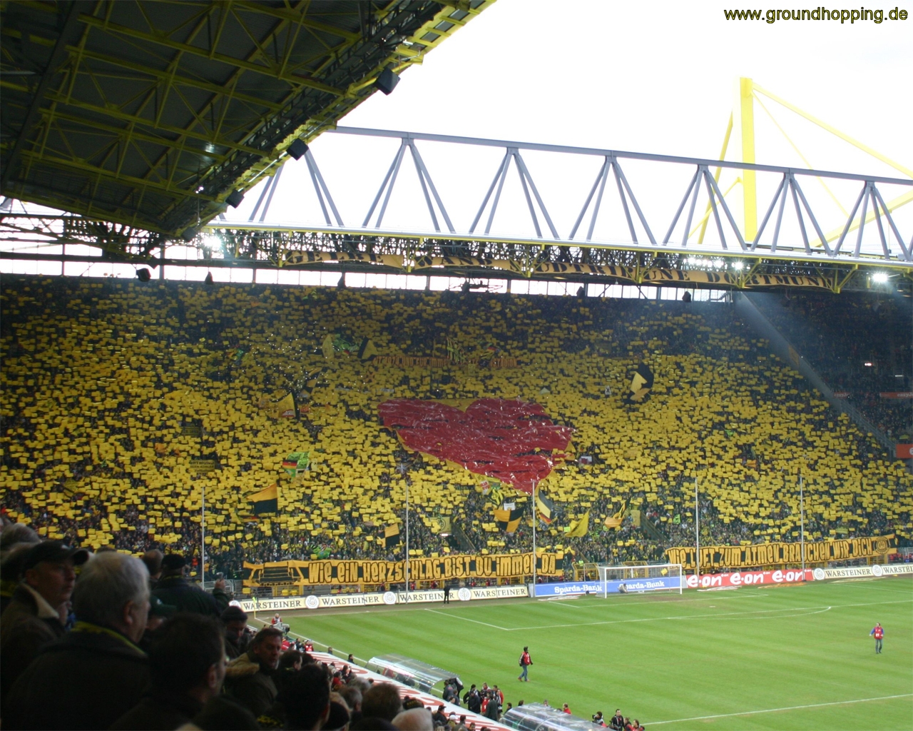 Zum Auftakt gibt es von Seiten der Borussia-Fans eine Choreographie, bei der mit Plastikbändern ein rotes Herz auf gelbem Grund gezeigt wird und mit Papptafeln für eine ansonsten komplett gelbe Südtribüne gesorgt wird. Mit den Transparenten "Seit 1974 und Westfalenstadion für immer - Westfalenstadion", "Wie ein Herzschlag bist Du immer da" und "wie die Luft zum Atmen brauchen wir Dich!" wird dazu deutlich gezeigt, daß sich die "schwarz-gelbe Wand" noch lange nicht mit der Umbenennung des Westfalenstadions in Signal-Iduna-Park abgefunden hat, die seit Anfang des Monats offiziell gilt, aber schon vorher zum Sprachgebrauch beim offiziellen BVB geworden ist. Auf Hannoveraner Seite zeigt man beim Intro einige Doppelhalter, bei denen übrigens unter anderem "gegen den modernen Fußball" und "gegen Rassismus" Stellung bezogen wird. Im weiteren Verlauf der Partie zeigen sich vor allem die Fans aus Hannover gut aufgelegt und supporten über 90 Minuten unermüdlich, wobei es auch immer mal wieder zu Wechselgesängen kommt. Die BVB-Fans stehen in der Anfangsphase nicht zurück und feuern ihr Team an, nehmen in der Mitte des Spiels aber eine Auszeit, bevor es nach dem 0:2 noch mal zu breitem Support auf der Südtribüne kommt, als man seinem Team ein "You'll never walk alone" mit auf den Weg in die Kabine schickt - auf der Haupttribüne ist zu diesem Zeitpunkt allerdings schon kaum noch jemand da, um das mitzubekommen.