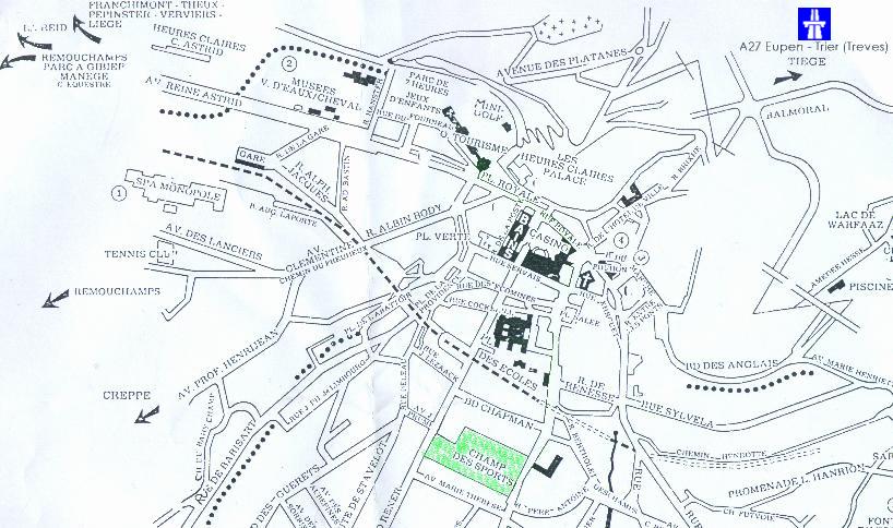 Das Stade Géronstère ist absolut besuchenswert und das liegt ganz alleine an der äußerst Stade Géronstère - Tribüne beeindruckenden Tribüne, die eine Längsseite der Anlage einnimmt. Das ist zwar kein Wunder - der Rest des Stadions ist zwar begehbar, aber zumindst auf den ersten Blick ohne jeden Ausbau -, doch diese Tribüne würde mit ihrem mächtigen Schieferdach, das im Sichtbereich der auf Holzbänken sitzenden Zuschauer abgestützt ist und über keinen echten Giebel, aber einen kleinen Knick im vorderen Bereich verfügt, auch anderswo ins Auge fallen. Auf der linken Seite verfügt das gute Stück übrigens auch über eine Seitenwand, die auf der anderen Seite fehlt, und im unteren Bereich des guten Stücks ist noch die Vereinskneipe des Spa FC sowie ein nur gegen speziellen Nachweis zugänglicher VIP-Raum zu finden. Wenn man sich die Mühe macht, den Platz zu umrunden, stößt man übrigens auf der Gegenseite auf zwei Stufen, man kann also auch hier von einem zumindest im Ansatz vorhandenen Ausbau sprechen. Zuletzt verfügt die Anlage auch über ein Flutlicht, das mit einigen wenigen Strahlern, die zum Großteil einzeln an Masten um den Platz verteilt sind, einen äußerst mickrigen Eindruck macht, aber zumindest in Ausnahmefällen für das Austragen von Flutlichtspielen ausreicht, wobei der Standardtermin für Spiele der Hausherren dann aber doch eher der Sonntagnachmittag ist. Gelegen ist die Anlage übrigens mitten in der Innenstadt von Spa unweit vom Casino (siehe Lageplan).